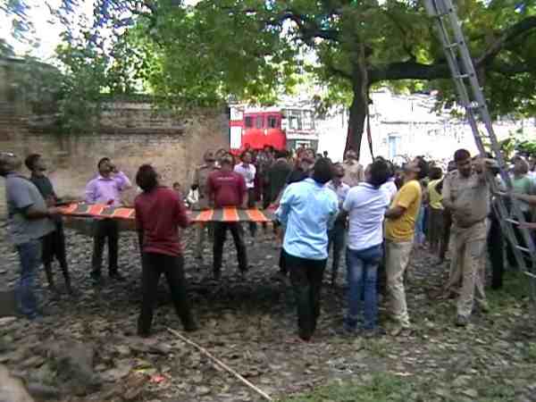 सूचना मिलने पर पुलिस और दमकल कर्मी मौके पर पहुंच गए। तुरंत पेड़ के सहारे से सीढ़ी लगाकर उसको उतारने की कोशिश होने लगी। सात-आठ लोगों ने नीचे एक बड़ी सी दरी को आपातकाल जाल की तरह उपयोग में लाने के लिए उसे पकड़ कर खड़े हो गए कि अगर साधु ऊपर से नीचे गिरता है तो उसे चोट न लगे। करीब चार घंटे की कड़ी मशक्कत के बाद उसे दमकल कर्मी पेड़ से नीचे उतार ले आए।