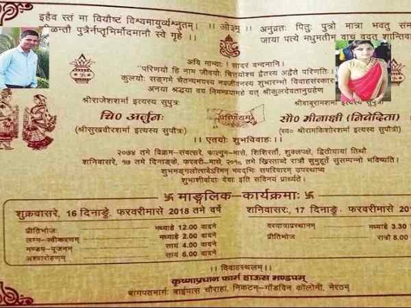 16 फरवरी को अर्जुन और मीनाक्षी की शादी है। दोनों ही संस्कृत के टीचर हैं और इस भाषा से बेहद प्यार करते हैं। इन लोगों ने अपनी शादी का कार्ड, स्वागत कार्ड, मेन्यू, प्लेकार्ड आदि सभी कुछ संस्कृत में रखा है। ऐसा करने के पीछे इन लोगों के अपने तर्क हैं। अर्जुन मुजफ्फरनगर के रहने वाले हैं और मीनाक्षी मेरठ की हैं। अर्जुन ने बनारस से पढ़ाई की और उसके बाद मेरठ कॉलेज से एमए किया। फिलहाल अर्जुन और मीनाक्षी दोनों ही संस्कृत के टीचर हैं। अर्जुन के मित्र नील कमल ने ही यह रिश्ता तय कराया।