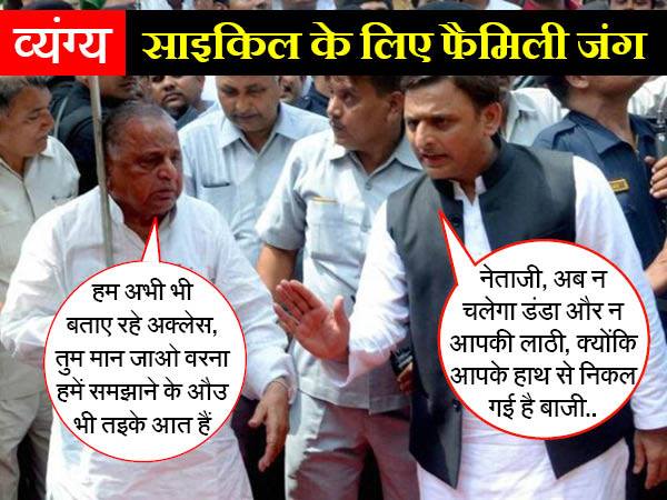 अखिलेश- हम आपको पीछे बैठाने को कब मना किए, लेकिन चाचा शिवपाल बार-बार साइकल के टायर की हवा निकाल कर भाग जाते हैं। हम हवा भरते हैं तो चाचा साइकिल पीछे से खींचते रहते हैं चलने नहीं देते। हम कित्ती बढ़िया साइकिल चलाते हैं, ये आप जानते हैं नेताजी लेकिन आपके कैरियर पर बैठते ही चाचा कहते हैं गिरा देगा, गिरा देगा और आप उनकी बातों में आकर उतर जाते हैं नेताजी, हमें बताइए कि क्या आप हमें अभी भी सीखू साइकिल चलाने वाला मानते हैं।