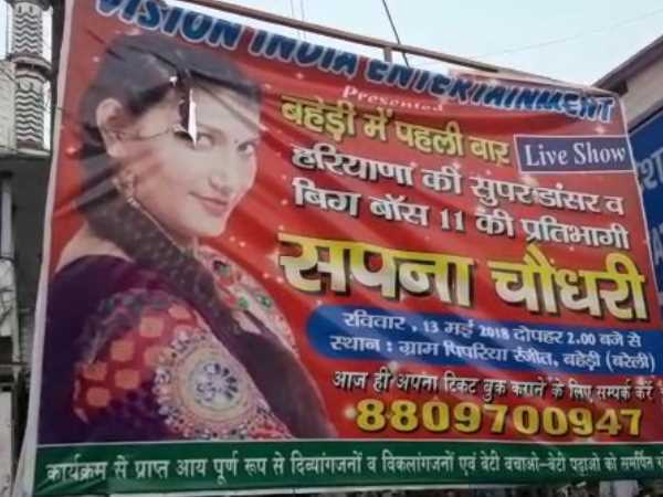 बरेली। हरियाणा की मशहूर डांसर सपना चौधरी का आगामी तीन जून को बरेली में डांस शो का प्रोग्राम होना है। इसी मौके को भुनाते हुए तथाकथित विज़न ग्रुप ने बहेड़ी के पिपरिया गांव में 13 मई को सपना चौधरी का डांस शो होने के पोस्टर्स, बैनर्स, बहेड़ी नगर एवं ग्रामीण इलाकों सहित उत्तराखंड के कई जगह पर लगवा दिए। इसके साथ ही इन तमाम जगह पर टिकट बेचने के लिए काउंटर भी लगवाए गए, जिसमें प्रति व्यक्ति 200 रुपये से लेकर एक हजार रुपये प्रति व्यक्ति तक के टिकट बेचे गए। जिसमे सपना चौधरी का शो देखने के लिए लाखों रुपये के टिकट लोगों ने खरीद लिए।