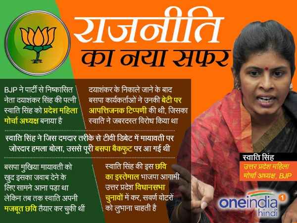 दयाशंकर सिंह को बीएसपी सुप्रीमो मायावती के खिलाफ अभद्र टिप्पणी के खिलाफ बीजेपी से निकाल दिया गया था। दयाशंकर सिंह यूपी बीजेपी के उपाध्यक्ष थे। अब बीजेपी ने दयाशंकर सिंह की पत्नी स्वाति सिंह को यूपी बीजेपी महिला विंग का अध्यक्ष बनाया है।