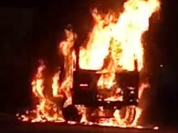 चौराहे पर पुलिस बूथ तोड़ता हुआ धू-धूकर जला ट्रक, 3 पुलिसकर्मियों समेत 4 की मौत
