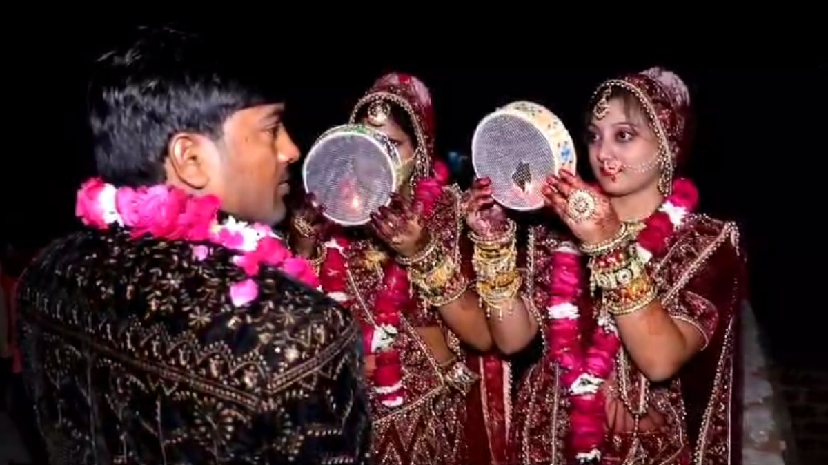 दरअसल, नीचे तस्वीर में आप देख सकते हैं कि एक शख्स को दो पत्नियां एक ही छन्नी से देख रही हैं। इस शख्स का नाम है रामबाबू निषाद और यह आगरा के थाना एत्माद्दौला नगला बिहारी का रहने वाला है। इसकी दो पत्नियां हैं और दोनों ने एक दूसरे को बहन मान लिया है। इनमे से एक पत्नी पिछले 8 वर्षों से लगातार करवाचौथ मनाती आ रही है और दूसरी पत्नी का यह पहला करवाचौथ था।