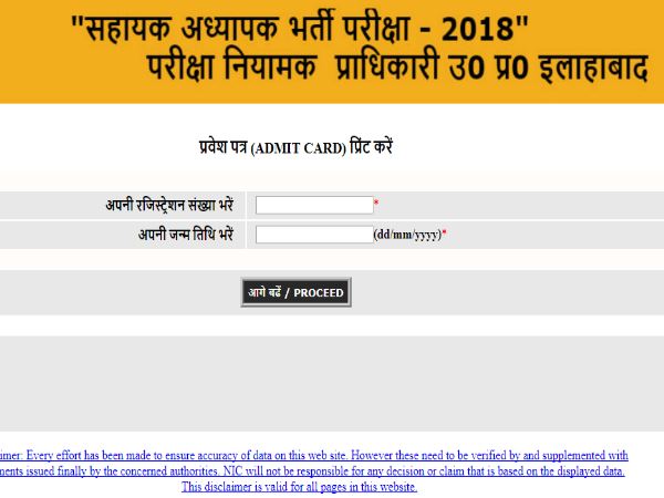 इस लिंक पर क्लिक करने के बाद आपके सामने सहायक अध्यापक भर्ती 2018 परीक्षा नियामक प्राधिकारी उत्तर प्रदेश इलाहाबाद का पेज खुल कर आएगा। इसमें नीचे प्रवेश-पत्र प्रिंट करने के लिए जगह दी होगी। सबसे पहले अपना रजिस्ट्रेशन संख्या डालें और फिर जन्मतिथि डालकर प्रोसीड पर क्लिक करें आपका एडमिट कार्ड डाउनलोड हो जाएगा।