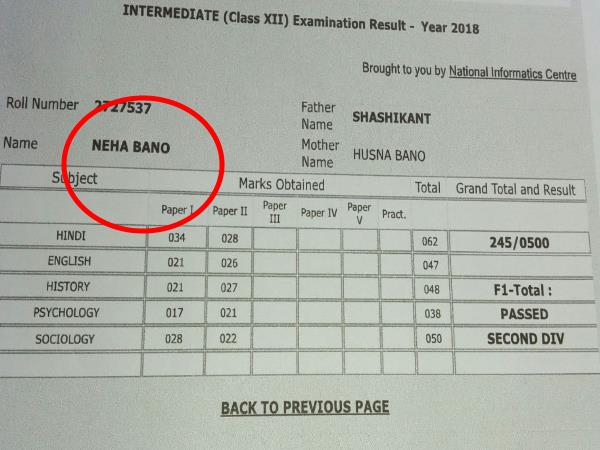 यूपी बोर्ड ने बदल दिया छात्रा का मजहब, नेहा जायसवाल से बना दिया नेहा बानो
