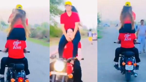 बाइक पर स्टंट करती एक के ऊपर एक लड़की