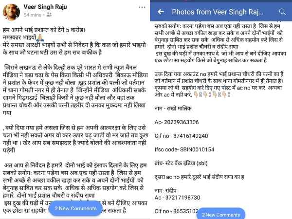 यूपी पुलिस के सिपाही ने अब प्रशांत को बचाने के लिए सोशल मीडिया पर पैसे जमा करने के लिए मुहिम शुरू कर दी है। इसके लिए कॉस्टेबल रोहित पाल ने बाकायदा दो अकाउंट नंबर भी जारी किया है। इसमें से एक अकाउंट नंबर प्रशांत चौधरी की पत्नी का है। तो दूसरा अकाउंट नंबर संदीप राणा के नाम का वायरल किया जा रहा है। इस अकाउंट में कांस्टेबल पैसा भेजकर उसका स्क्रीन शॉट भी सोशल मीडिया पर वायरल कर रहे हैं। इस घटना के बाद से सिपाहियों में काफी गुस्सा देखने को मिल रहा है और उनका कहना है कि जब असलहे से आत्मरक्षा भी नहीं कर सकते तो क्यों दिया जाता है।