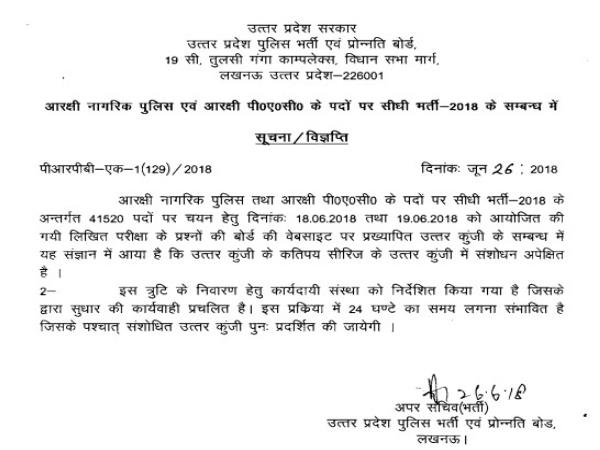 गौरतलब है कि सिपाही के 41,520 पदों पर भर्ती के लिए 18 और 19 जून को हुई लिखित परीक्षा की आंसर-की बोर्ड की वेबसाइट पर मंगलवार को अपलोड की गई। इसके जारी होने के कुछ समय बाद ही कुछ सिरीज में गड़बड़ी की शिकायतें मिलने लगीं। शिकायतें मिलने के बाद तुरंत ही बोर्ड ने आंसर-की हटा दी। इस मामले में कार्यदायी संस्था को सुधार के लिए निर्देश दिए गए हैं। इसके साथ ही यह संभावना भी जताई जा रही है कि बुधवार या गुरुवार तक सही आंसर-की अपलोड की जाएगी।