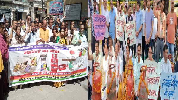 महंगाई की मार को लेकर कांग्रेसियों ने सड़कों पर उतरकर किया जमकर प्रदर्शन, सिलेंडर पर माला पहनाकर जताया विरोध