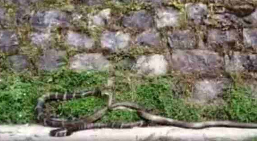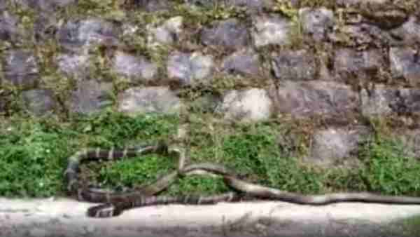 नैनीताल। उत्तराखंड के नैनीताल जिले की सड़क पर किंग कोबरा और रेट स्नेक की बीच खूनी संघर्ष हो गया। इस दौरान सांपों की लड़ाई देखने के लिए राहगीरों की भीड़ लग गई। जब लोगों ने पास जाकर देखा तो एक सांप दूसरे सांप को निगल रहा था। लोगों ने इसकी सूचना वन विभाग को दी। साथ ही इस पूरी लड़ाई का वीडियो भी बनाकर सोशल मीडिया पर वायरल कर दिया।