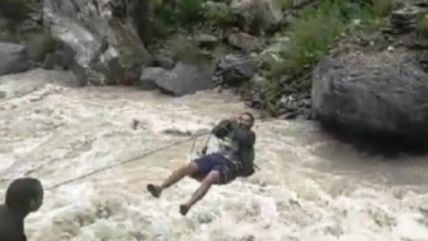 चमोली: मूसलाधार बारिश में बहा एकमात्र पैदल पुल, रस्सी से लटक कर यूं रास्ता पार कर रहे लोग