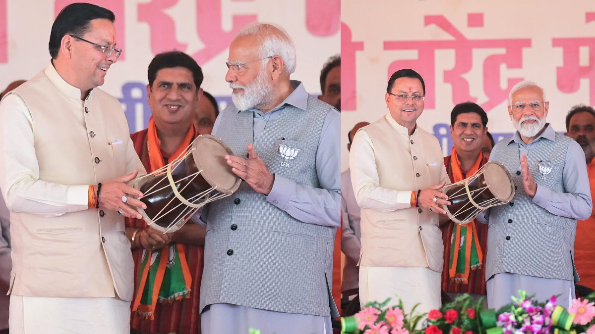 Uttarakhand: प्रधानमंत्री नरेंद्र मोदी ने गुरुवार को ऋषिकेश के आईडीपीएल खेल मैदान में भाजपा की चुनावी जनसभा को सम्बोधित किया। इस दौरान उत्तराखंड के मुख्यमंत्री पुष्कर सिंह धामी ने पीएम नरेंद्र मोदी को उत्तराखंड का पारंपरिक वाद्य यंत्र हुड़का यानी डमरू भेंट किया,जिसे पीएम मोदी ने पूरी तन्मयता के साथ बजाया। मुख्यमंत्री पुष्कर सिंह धामी ने यह तमाम वीडियों सोशल मीडिया प्लेटफार्म पर शेयर किया है।