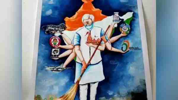 काशी के आर्टिस्ट अरविंद ने इस पेंटिंग में भारत के नक्शे को तिरंगे में रंगा है साथ ही पीएम मोदी को 10 हाथों के साथ दिखाया गया। पेंटिंग में पीएम मोदी मास्क लगाकर और हाथ में झाड़ू लिए देशवासियों को सफाई का संदेश दे रहे हैं। अरविंद ने अपनी इस पेंटिंग के माध्यम से मोदी सरकार द्वारा किए गए 10 प्रमुख योजनाओं को भी दर्शाया गया है। इन योजनाओं में स्किल इंडिया, बेटी बचाओ बेटी पढ़ाओ, स्वच्छता अभियान, प्रधानमंत्री धन जन योजना, डिजिटल इंडिया, उज्वला योजना, मेक इन इंडिया, राफेल, राममंदिर और वैश्विक महामारी कोरोना काल में सरकार द्वारा किए गए प्रयासों को उकेरा गया है।