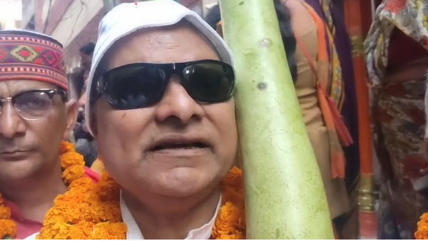 वाराणसी। रंगभरी एकादशी को बाबा विश्वनाथ और माता पार्वती की पालकी यात्रा में चढ़ावा चढ़ाने महन्त के घर किसान 5 फीट लंबी दो लौकी लेकर पहुंचा। किसान के हाथों में इतनी बड़ी लौकी देख वहां लोग हैरान थे। किसान भी लौकी के साथ भोलेनाथ की बारात में शामिल हुआ।