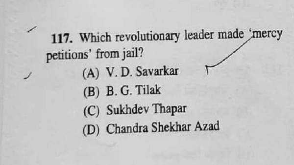 कोलकाता, अगस्त 24। पश्चिम बंगाल पब्लिक सर्विस कमिशन के एग्जाम में अब वीडी सावरकर को लेकर पूछे सवाल को लेकर विवाद खड़ा हो गया है। दरअसल, रविवार को हुई इस परीक्षा में सवाल पूछा गया था कि "किस क्रांतिकारी नेता ने जेल से 'दया याचिका' दाखिल की थी?" इस सवाल के चार विकल्प थे- वीडी सावरकर, बीजी तिलक, सुखदेव थापर और चंद्र शेखर आज़ाद। इस सवाल को लेकर बीजेपी ने आपत्ति जताई है।