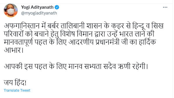 सीएम योगी ने ट्वीट कर कहा कि अफगानिस्तान में बर्बर तालिबानी शासन के कहर से हिंदू और सिख परिवारों को बचाने के लिए आदरणीय प्रधानमंत्री जी का हार्दिक आभार। विशेष विमान से उन्हें भारत लाने की मानवतापूर्ण पहल की गई। इसके साथ ही सीएम योगी ने कहा कि आपकी इस पहल के लिए मानव सभ्यता हमेशा ऋणी रहेगी...जय हिंद!