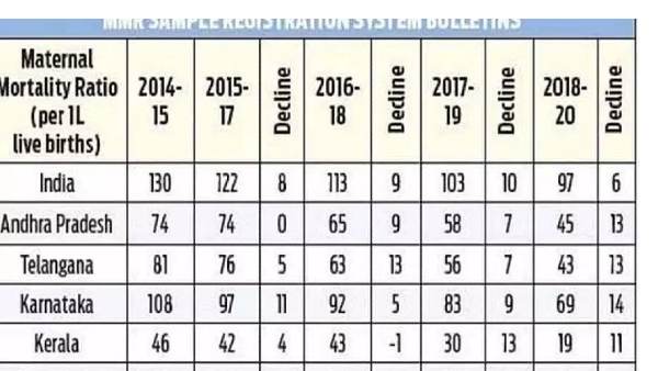 नई दिल्ली,1 नवंबर: 2018-2020 बुलेटिन के अनुसार, आंध्र प्रदेश मातृ मृत्यु दर (MMR) की स्थिति में देश में चौथे स्थान पर है, जिसमें हर एक लाख जीवित जन्मों पर 45 MMR है। केरल 19 के कम MMR के साथ शीर्ष पर रहा, उसके बाद महाराष्ट्र और पड़ोसी राज्य तेलंगाना क्रमशः 33 और 43 के साथ रहा। एमएमआर की नवीनतम स्थिति मंगलवार को रजिस्ट्रार जनरल के नमूना पंजीकरण प्रणाली (एसआरएस) कार्यालय द्वारा 2018-20 के लिए भारत में मातृ मृत्यु दर पर विशेष बुलेटिन में प्रकट की गई।