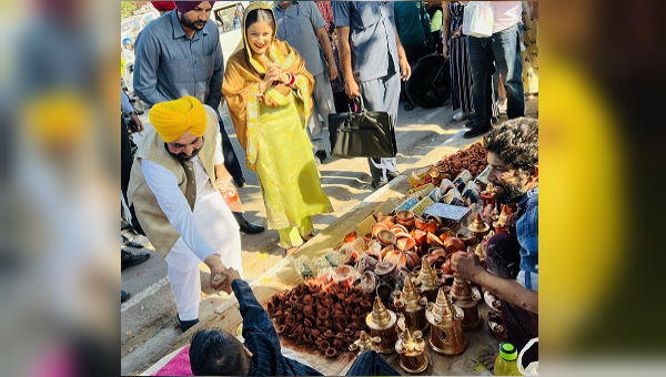 मोहाली। दिवाली के पर्व के मौके पर पंजाब के मुख्यमंत्री भगतवंत मान अपनी पत्नी सहित गुरुद्वारा श्री अंब साहिब मोहाली में नतमस्तक हुए। इस दौराव वापस आते समय गाड़ी रोकर सड़क किनारे बैठे दीये बेचने वालों से दीये खरीदे और वहां पर मौजूद लोगों से बातचीत भी की। दीये खरीदने के समय पंजाब के मुख्यमंत्री भगतवंत मान व उनकी पत्नी कारीगरों से बातचीत करते हुए नजर आए।