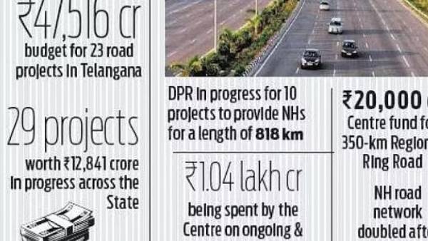"भारत सरकार तेलंगाना में 3700 किलोमीटर की चल रही और आगामी परियोजनाओं पर 1.04 लाख करोड़ रुपये खर्च कर रही है। लगभग 350 किलोमीटर लंबी प्रतिष्ठित क्षेत्रीय रिंग रोड परियोजना का निर्माण भारत सरकार के 20,000 करोड़ रुपये के वित्त पोषण से किया जाएगा। इस बीच, NHAI ने 2,500 करोड़ रुपये की अनुमानित लागत से मनचेरियल और वारंगल के बीच एक ग्रीनफ़ील्ड राजमार्ग के निर्माण के लिए निविदाएं आमंत्रित की हैं। यह मनचेरियल के नरवा गांव से वारंगल जिले के ऊरुगोंडा गांव तक 108 किलोमीटर की दूरी को कवर करने वाला एक चार-लेन पहुंच-नियंत्रित ग्रीनफील्ड राजमार्ग होगा।