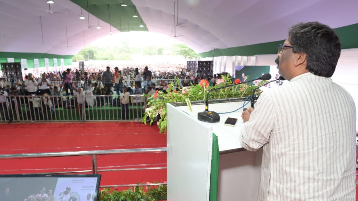 झारखंड सीएम हेमंत सोरेन मंगलवार को चाकुलिया के केरूकोचा हाट मैदान में शहीद साबुआ हांसदा के 36 वें शहादत दिवस के अवसर पर आयोजित शहीदों की श्रद्धांजलि सभा व परिसंपत्ति वितरण समारोह को संबोधित कर रहे थे।