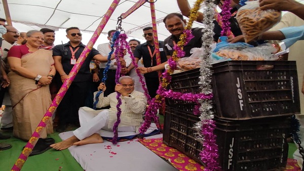 महिलाओं ने मुख्यमंत्री भूपेश बघेल का छत्तीसगढ़ी व्यंजनों से तौलकर किया सम्मान